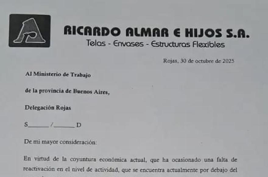 En una nota dirigida a la Delegación Rojas del Ministerio de Trabajo, la firma argumentó que la "coyuntura económica actual" ha provocado una "falta de reactivación en el nivel de actividad, que se encuentra actualmente por debajo del punto de sustentabilidad".
